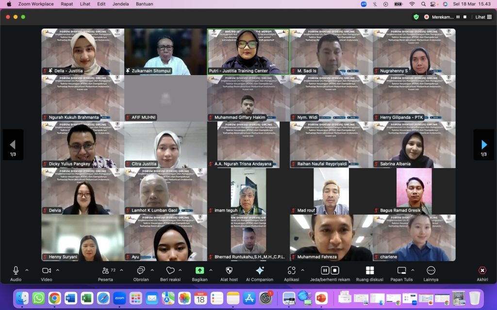 Justitia Training Center bekerja sama dengan Perkumpulan Ahli & Konsultan Hukum Jasa Keuangan (PAKHJK) sukses menyelenggarakan Forum Diskusi (FOKUS) Online dengan tema “Implementasi UU Pengembangan dan Penguatan Sektor Keuangan (P2SK) dan Dampaknya Terhadap Restrukturisasi Perbankan Indonesia.” secara daring pada Selasa (18/03/25).